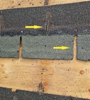 At right is a picture of an aged three-tab shingle with its fatal flaw, weathered through where the overlapping shingle's gap sat. For reference, one current manufacturer offers a 5 year warranty on their Marathon (3-tab) shingle. This is only 1/3 of the 15 year "iron clad" warranty offered for IKO Cambridge and Dynasty shingles, and says a lot about what shingle manufacturers think about the longevity of the 3-tab style. One more bit of trivia that some customers might find interesting, 25-30 years ago, 25 year shingles actually did usually last more than 20 years. It was only in the past 15-20 years that the quality of the 3-tab shingle fell off a cliff, as manufacturers switched their product lines over to the architectural/laminate/"lifetime" shingles. We guess 3-tabs just were no longer a priority. We still use the Marathon 3-tab shingles for ridge on many houses, but because of the nature of ridge shingles, these are usually the last shingles to wear out, so they do not affect the lifespan of a Cambridge or Dynasty roof.